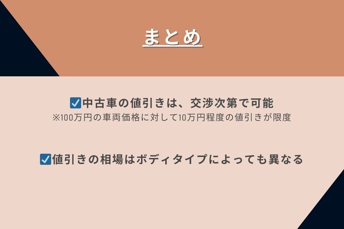 中古車の値引きは、交渉次第で可能です。値引きの相場はボディタイプによって異なり、軽自動車などよりも、セダンタイプのほうが値引きが大きい傾向にあります。交渉の際は、事前に価格を調べたり月末や決算時期を狙ったりとコツを押さえることが大切です。