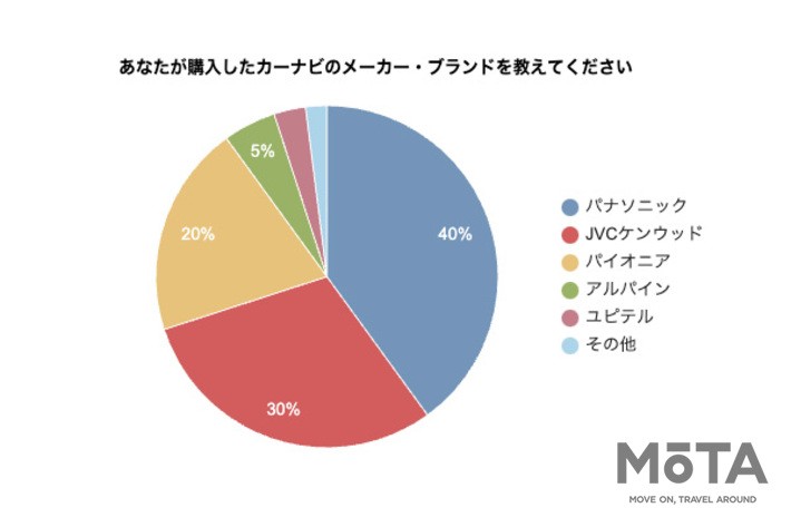 もっともシェアを獲得していたのはパナソニックが40%、JVCケンウッドが30%、パイオニアが20%、アルパインが5%、ユピテルが3%、その他が2%でした。