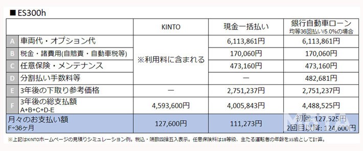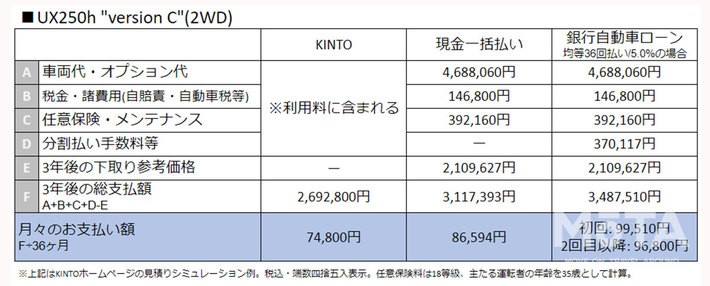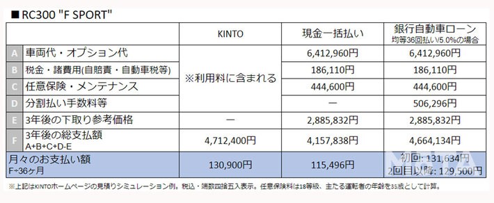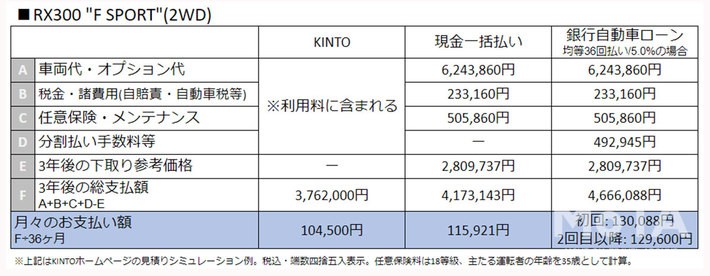 現在、WEB上で契約できるレクサスはUX、RX、ES、RCの4車種。KINTO/現金一括払い/銀行自動車ローン(均等36回払い/金利5.0%)で、計算してみると、月々の支払い額は下記のようになる。