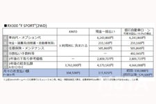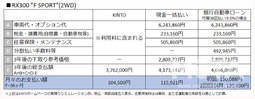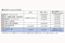 現在、WEB上で契約できるレクサスはUX、RX、ES、RCの4車種。KINTO/現金一括払い/銀行自動車ローン(均等36回払い/金利5.0%)で、計算してみると、月々の支払い額は下記のようになる。