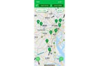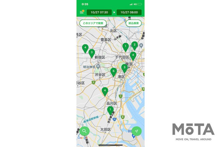 登録完了後、アプリを開くと地図が表示されます。地図の上にクルマを借りたい日時が表示されるので、日程を設定すると、地図の中のバルーンの中に数字表示されます。これが各営業所にあるチョクノリで利用できるクルマの台数です。