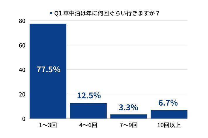 まずは「車中泊は年に何回ぐらい行きますか?」の年間実施回数から。「1〜3回」が77.5%で、2位の「4〜6回」(12.5%)と大きく差を開けてのトップ。