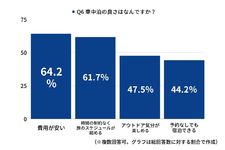 「車中泊の良さ」という質問では、やはり「費用が安い」が64.2%で1位でした。2位以下は「時間の制約がなく、旅のスケジュールが組める」(61.7%)、「アウトドア気分が楽しめる」(47.5%)、「予約なしでも宿泊できる」(44.2%)と続きます。