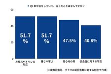 一方、「車中泊で困ったこと」という質問では、トップ3は以下のとおりです。1位が同率で「お風呂やトイレなどの対応」と「暑さや寒さ」(51.7%)、3位が「寝心地の質」(47.5%)。