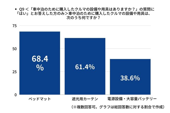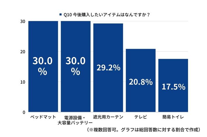 さらに「今後購入したいアイテム」を尋ねると、「ベッドマット」(30.0%)と「電源設備・大容量バッテリー」(30.0%)が同率トップ。3位が僅差で「遮光用カーテン」(29.2%)。4位以下は「テレビ」(20.8%)、「簡易トイレ」(17.5%)と続きます。ちなみに「ない」と答えた人は27.5%もいました。