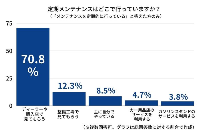 「ディーラーや購入店で見てもらう」と答えた方は70.8%におよびました。「ディーラーは費用が高い」と敬遠する人がいるようですが、購入したお店との関係を大事にしている方が多いということがわかりました。2位は「整備工場で見てもらう」(12.3%)。