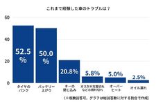 1位は「タイヤのパンク」で、52.5%の方が経験しています。常日頃からタイヤの空気圧をチェックしておく必要があるようですね。