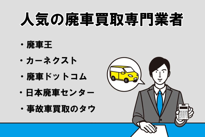 車の一括査定や中古車専門店で売れなかった不動車におすすめの廃車買取専門業者は、以下の5つです。