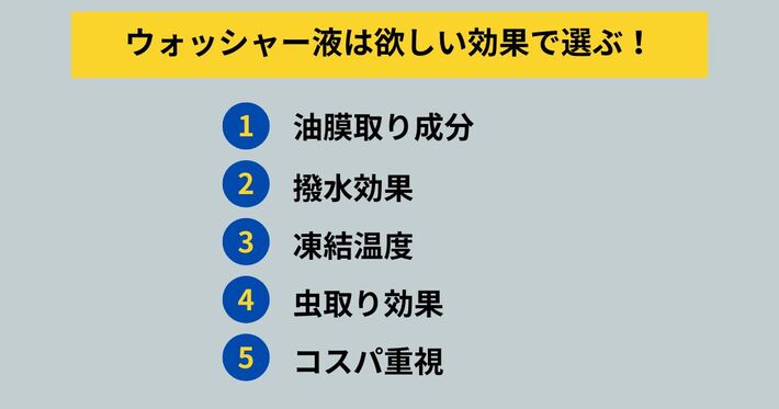 ウォッシャー液の選び方について、ポイント別に詳しく解説します。凍結温度という、地域によっては重要な項目も紹介しているので、ウォッシャー液を購入する前に一度確認してください。