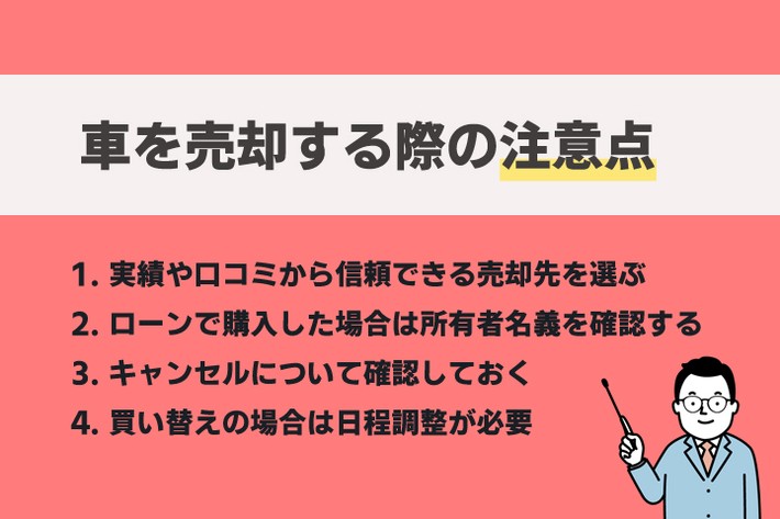 車を売却する際は、売却先の選定や契約内容・手続き、スケジュールなどさまざまな点に気を遣う必要があります。中でも注意すべき点は以下のとおりです。