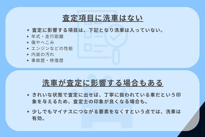 査定項目に洗車は入っていないため、洗車をしているかどうかは直接査定額に影響するわけではありません。