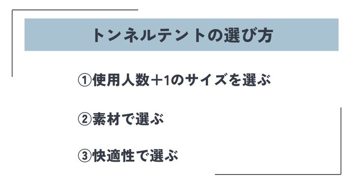 トンネルテントを選ぶ際には、使用人数にプラス1を考慮し、利用人数に合ったサイズを選ぶことが重要です。素材や特徴、遮光性や耐水圧などの要素も考慮しましょう。