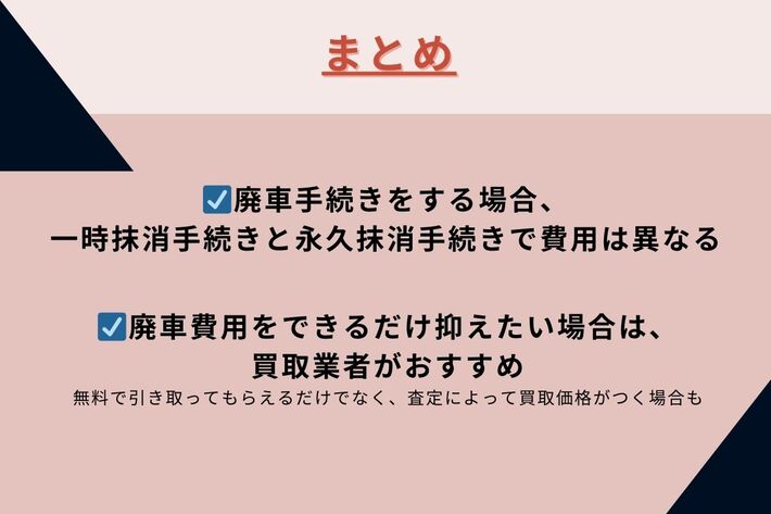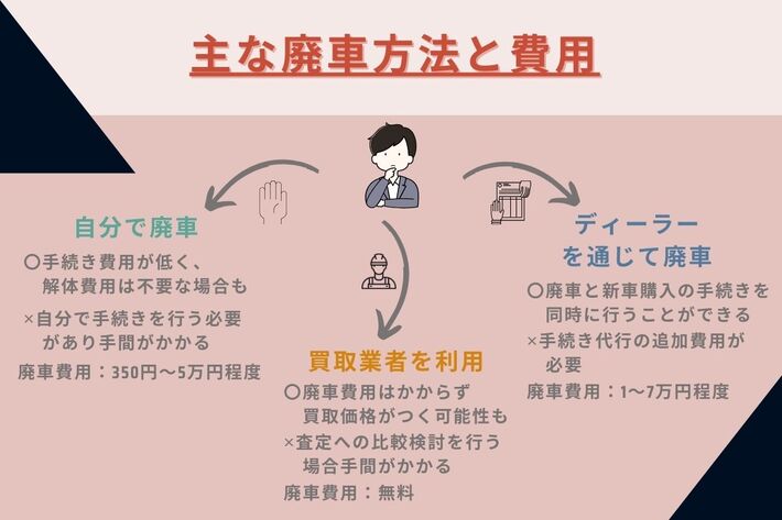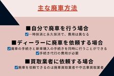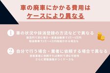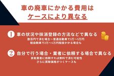 また、費用は自分で行う場合とディーラー・買取業者に依頼する場合でも異なります。買取業者に依頼すれば無料で済む可能性があり、さらに買取価格がつくかもしれません。詳しい内容は、あとの項目で解説します。