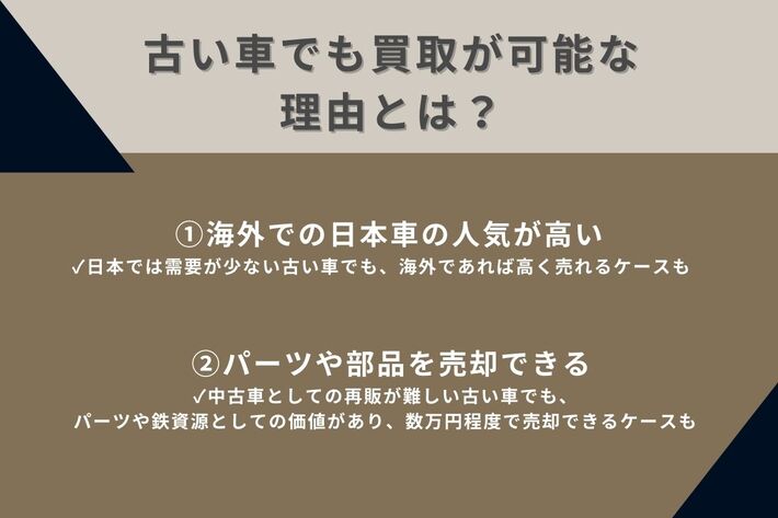 ここでは、古い車でも売却が可能とされる以下の2つの理由を解説します。