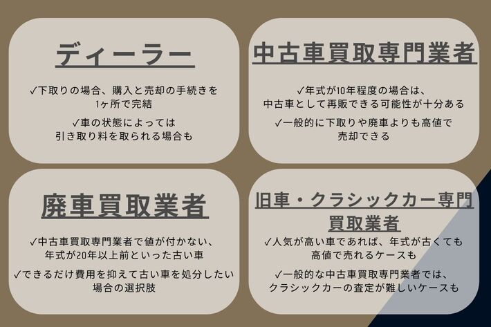 少しでも良い条件で愛車を売却するには、それぞれの特徴を知り、車の状態にあった買取業者を選ぶことが肝心です。
