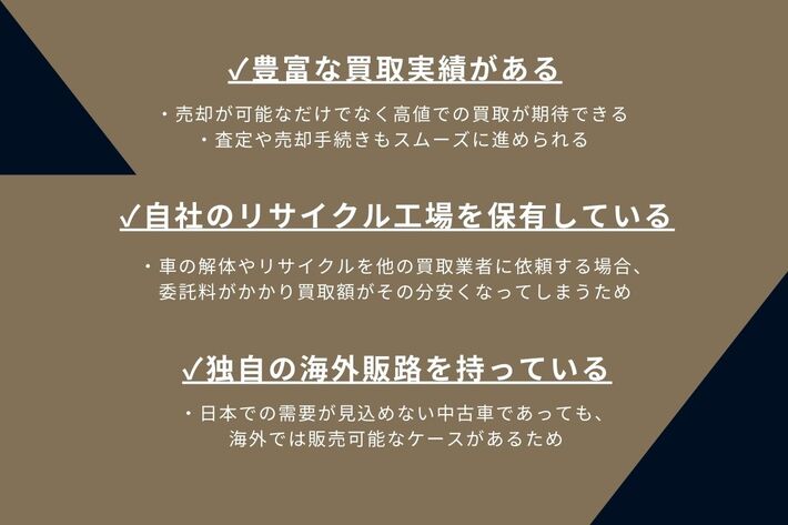 古い車をできるだけ高く売りたいのであれば、買取業者選びも重要です。ここでは、古い車の高値での売却が期待できる買取業者選びのポイントを3つ解説します。