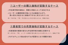 | 1~3月/7~8月 | 上昇 | ユーザーの需要が高まる時期を見越して、仕入れの数を増やすため、需要が高まり価格が上昇する |