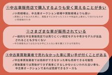 中古車販売店にはない、中古車オークションならではの魅力を確認し、売買方法の決定に役立てましょう。
