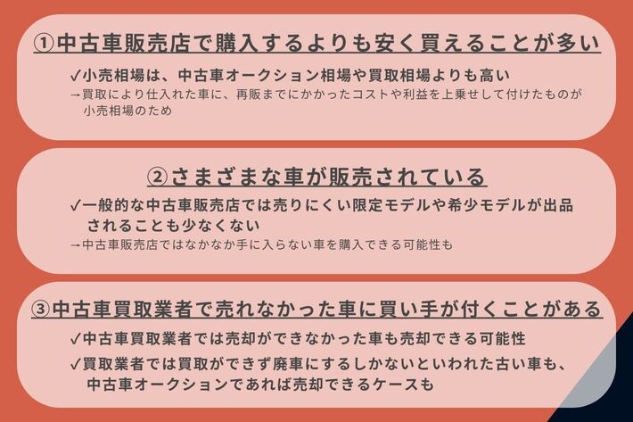 ここでは、オークションで中古車を売買する以下の3つのメリットを解説します。