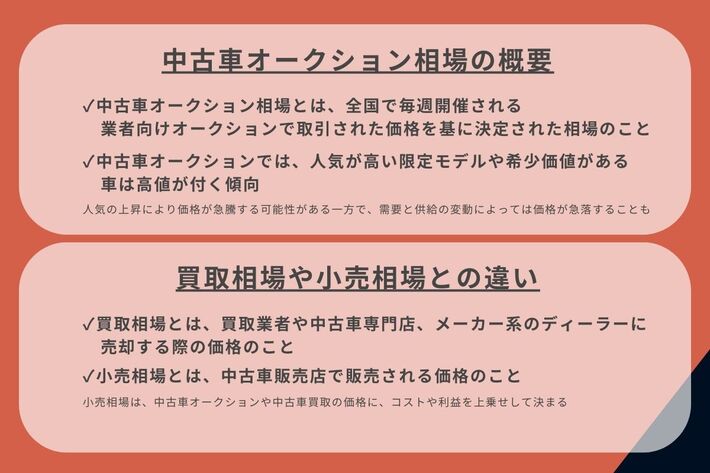 中古車オークションでの車の売買を検討しているのであれば、相場についても押さえておく必要があるでしょう。ここでは、中古車オークション相場の概要と、買取相場や小売相場との違いを解説します。相場の違いを確認し、取引方法を決める際の参考にしましょう。