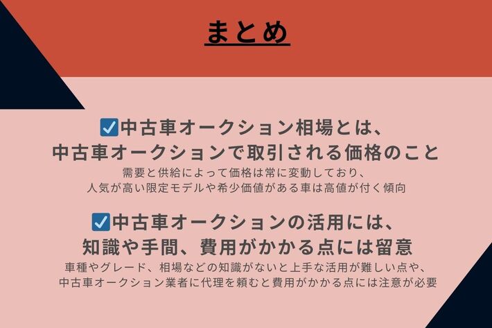 一方で、車種やグレード、相場などの知識がないと上手な活用が難しい点や、中古車オークション業者に代理を頼むと費用がかかる点には注意が必要です。
