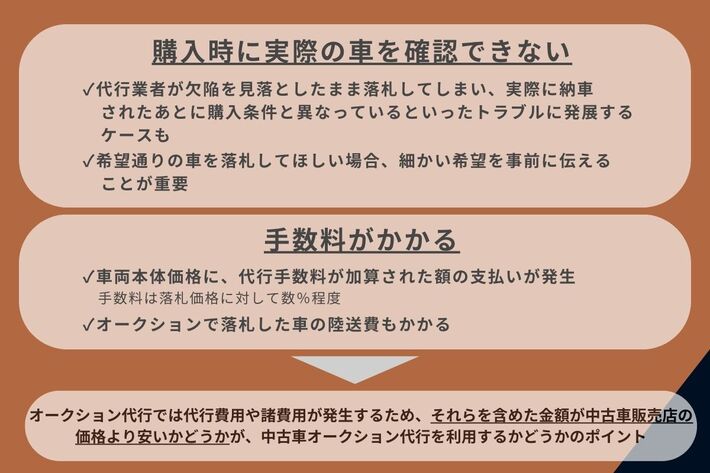 中古車オークション代行を利用して、車を購入するデメリットを解説します。主なデメリットは、次の2点です。