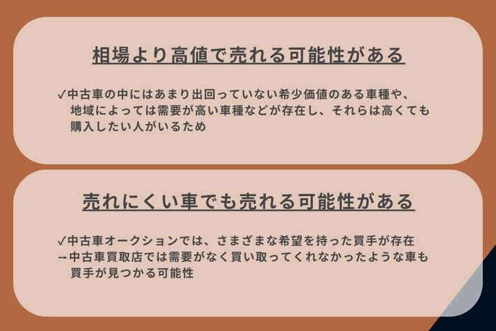 また、オークションでは競りで入札する人が増えれば増えるほど価格も上がっていくため、中古車買取店の査定価格より高く売れることが期待できるでしょう。