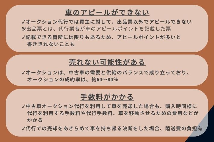 中古車オークション代行を利用して、車を売却するデメリットを解説します。主なデメリットは、次の3点です。