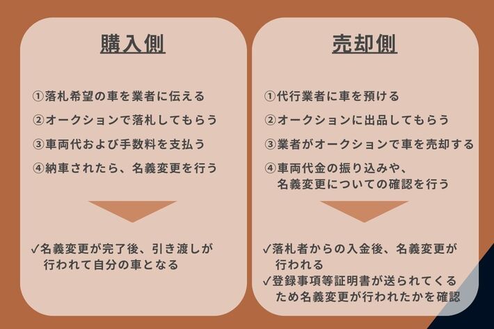 中古車オークション代行を利用する際の流れを、購入側・売却側それぞれの立場から紹介します。購入側・売却側共通の流れは次の通りです。