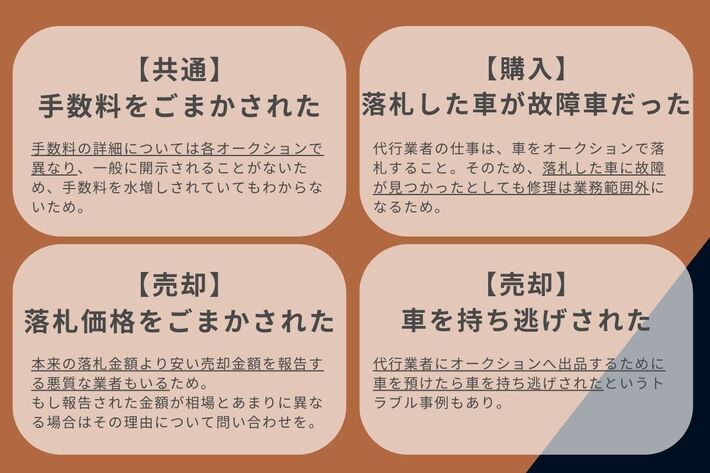 購入時に実際の車を確認できないため、代行業者が欠陥を見落としたまま落札してしまい、実際に納車されたあとに購入条件と異なっているといったトラブルに発展するケースが考えられます。