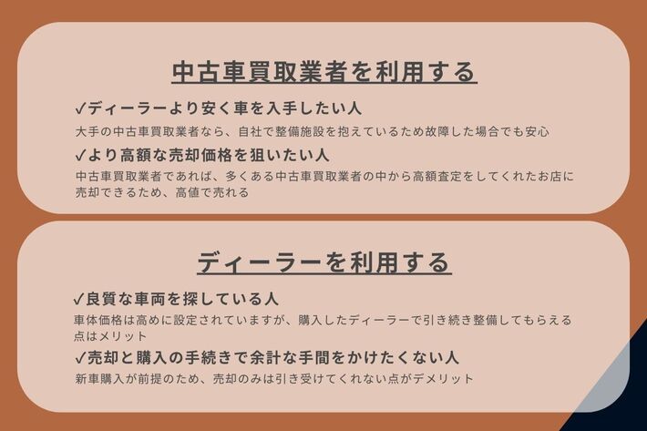 中古車オークション以外で車を売買する方法には、中古車買取業者を利用する方法とディーラーを利用する方法の2つがあります。各方法の詳細について見ていきましょう。