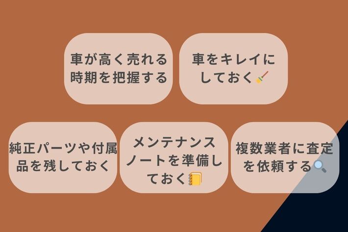 車をオークション代行と中古車買取業者で高く車を売るためのコツを紹介します。主なコツは、次の5つです。