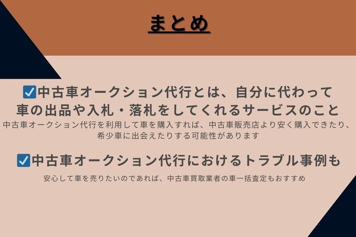 ただし、中古車オークション代行におけるトラブル事例も報告されています。安心して車を売りたいのであれば、中古車買取業者の車一括査定がおすすめです。