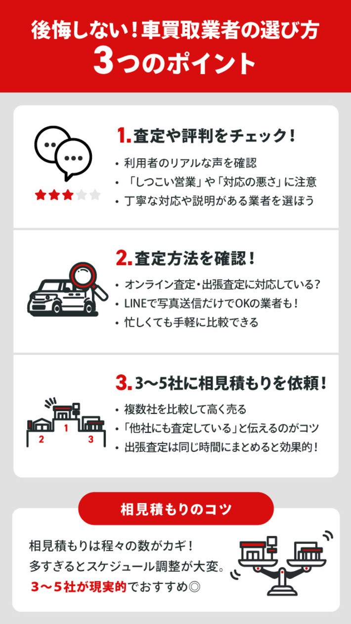ここでは、後悔しない買取業者選びのためにチェックしておきたい3つのポイントを解説します。