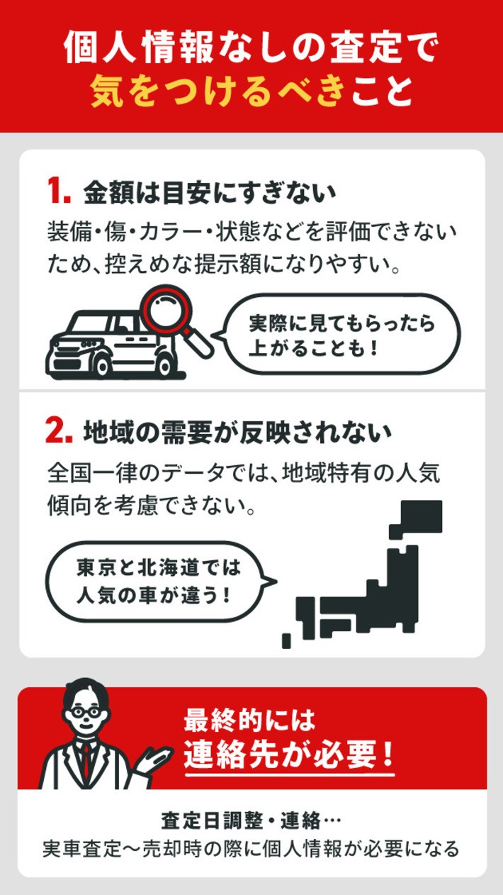 ただし、実際に売却を検討する際には、現車確認や買取業者とのやりとりが必要になるため、最終的に個人情報の登録は避けられないのが現実です。