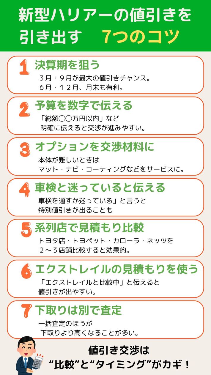 「エクストレイルで〇〇万円の値引きを提示されましたが、ハリアーのPHEVが気に入っています。同等の条件にしていただけますか?」「エクストレイルは3列シートが選べるのですが、ハリアーの高級感に惹かれています。価格面で近づけていただけませんか?」等と伝えることで、競合他社に負けないよう営業担当者も本気の値引きを提示してくれる可能性が高まります。実際にエクストレイルの見積もりを持参すると、さらに説得力が増すでしょう。