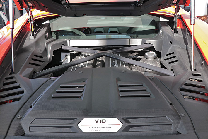 ランボルギーニ史上最高の5.2リッター自然吸気V型10気筒エンジンを特徴としており、最高出力640馬力、最大トルク600Nmを発揮。また停止状態から2.9秒で100km/hに到達、最高時速は325km/hを超えるというランボルギーニらしい“モンスターマシン”だ。