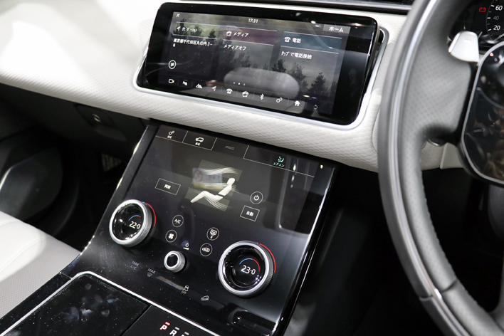 レンジローバー ヴェラールの新しさは外観のスタイリングだけに留まらない。内装もやはりエクステリア同様のモダンな世界観で統一されていた。中でも、上下に2つ配置される10.2インチの高解像度タッチスクリーン式インフォテイメントシステム”Touch Pro Duo”が新しい。例えば上がナビ、下はオーディオあるいはエアコン操作、といったように変幻自在に扱える。