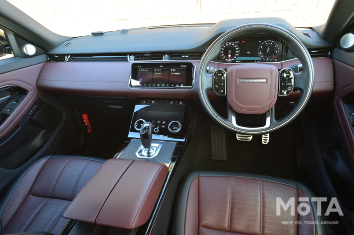 まず乗り込んだのは、美しい深みあるエンジ色に塗られた「レンジローバー・イヴォーク R-DYNAMIC HSE P300 MHEV」です。イヴォークは、「ジャガー Eペイス」「BMW X1」「X3」「アウディQ3」「ボルボXC40」など強豪ひしめく「プレミアムコンパクトSUV」という激戦区に投入されたエントリーモデル。シャープでスポーティなデザインをまとって2011年に登場しました。