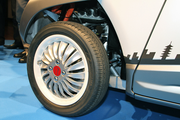 「FOMM コンセプト One」のフロント周り。タイヤサイズは145/65R15インチ。展示車は横浜ゴムのエコタイヤ「BluEarth AE01」を装着していた。