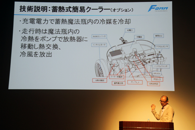 暑い東南アジア圏での販売を目論む「FOMM コンセプト One」には、EVにとって不利な冷房のために蓄熱式の簡易クーラーをオプションで設定する。充電時に蓄熱魔法瓶内の冷媒を冷却し、走行時は熱交換で冷風を放つ。冷却が出来ない場合でも、緊急時には氷を入れて代替することも可能だという。