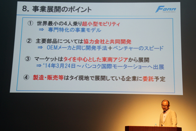 「FOMM」事業展開のポイントは1.世界最小の4人乗り超小型モビリティであること 2.主要部品については協力会社と共同開発(汎用品の流用ではなく、オリジナルの規格・自動車メーカーと同様の手法+ベンチャーのスピード感で) 3.タイを中心とした東南アジアから展開開始(バンコクモーターショー2014に出展) 4.製造・販売等はタイ現地企業に委託予定