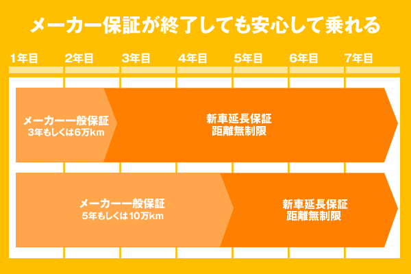 新車7年延長保証には距離の制限がなく、保証対象部品は上記一般保証、特別保証に準ずるものが対象で作業工賃も保証に含まれます。オプション品であってもメーカーの一般保証がついているものであれば延長保証の対象となります。