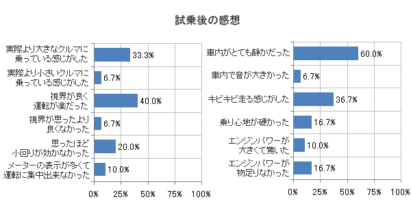 上の「試乗後の感想」データでは、「エンジンパワーが物足りなかった」16.7%、「エンジンパワーが大きくて驚いた」10.0%とある。