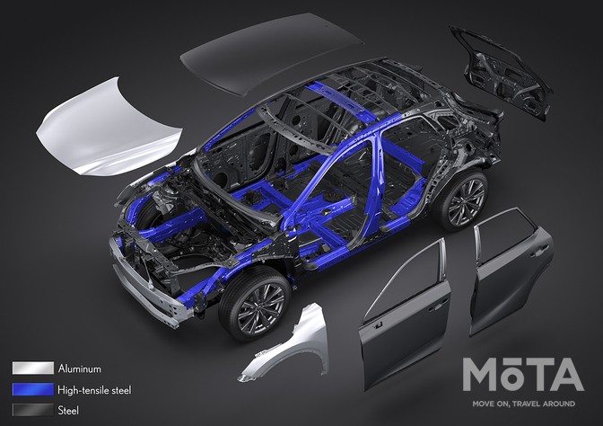 新型RXにはGA-K改良プラットフォームを採用。軽量化と低床化により、重心高を従来型から15mm下げている。また、プラットフォームの主要骨格部材の最適な材料置換に加え、フロントフェンダーのアルミ化などを進めたことで、車両重量は従来型比で90kg軽量化。重心を下げ、操縦安定性を向上させた。