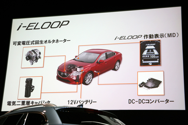 アテンザの減速エネルギー回生システム「i-ELOOP」は、乗用車用として世界で初めてキャパシタを使用した。