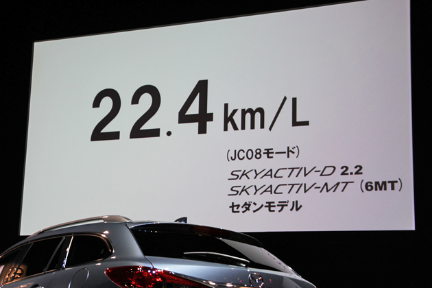 アテンザに搭載されるクリーンディーゼル「SKYACTIV-D」は高出力・高トルクを発生させるいっぽうで、22.4km/Lと、小型車並みの低燃費性能を誇る。