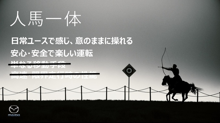 マツダの考え方と辞書は概ね合っているが、マツダが考える「人馬一体」とは、高速・限界走行時の性能よりも、日常ユースで意のままに操れる安心安全で楽しい運転感覚のこと。