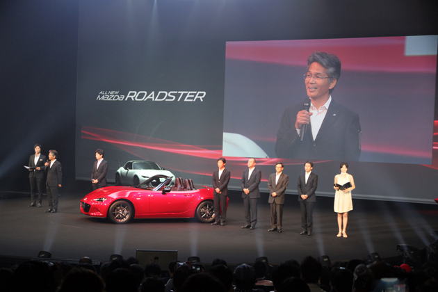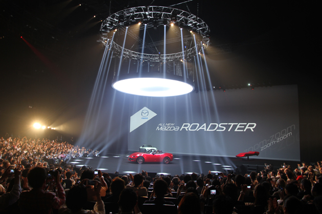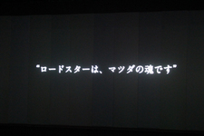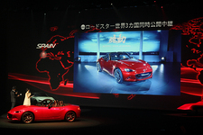 ステージではロードスターファンのインタビュー映像や25年・3世代に渡るマツダ ロードスターの歴史を紹介。2014年7月までに94万台の累計生産台数を数え、2人乗り小型オープンスポーツカーで世界一のギネス記録を更新中。2代目および3代目ロードスターの開発主査 貴島孝雄氏の「ロードスターは、マツダの魂です」という熱いメッセージが流れると、いよいよ新型4代目モデルの発表となった。