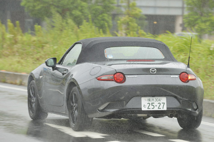 試乗した当日は運悪く台風が上陸していて雨風が強く打ちつけていたが、音も静かで風に振られることもなくRFの車内はいたって平穏だった。ソフトトップに比べると、やっぱりRFは「大人が嗜むスポーツカー」。